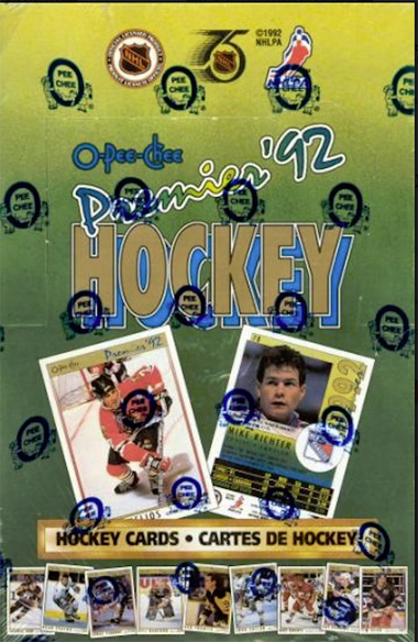 The 1991-92 O-Pee-Chee Premier hockey set contains 198 standard-size cards. Color player photos are bordered above and below in gold. Player name, team and position appear at the bottom. The backs have a small color player photo, biography, team logo and statistics. A Konstantinov variation can be found with Lidstrom’s photo on the back. Very few of these variations have been located. To commemorate the 75th Anniversary of the NHL, throwback sweaters were worn several times during the 1991-92 campaign by the original six teams. Cards portraying players in those sweaters are indicated by ORIG6. Key Rookies in this set are Vladimir Konstantinov, John LeClair, Tony Amonte, Nicklas Lidstrom, Doug Weight, and More!