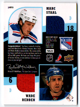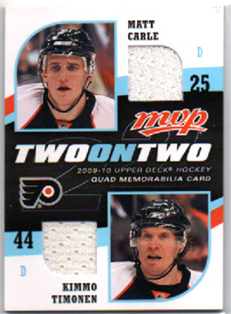 2009-10 UD MVP Two on Two QUAD Memorabilia Wade Redden, Kimmo Timonen, Marc Staal, Matt Carle #J-RTCS