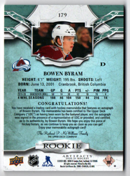 2020-21 Artifacts Hockey Bowen Byram 13/15 ROOKIE PATCH SIGNATURES #179