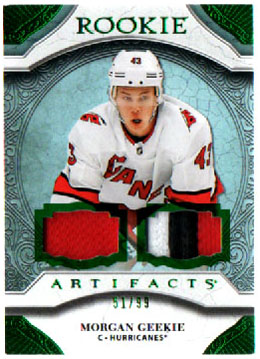 2020-21 Artifacts Hockey ROOKIE EMERALD JERSEY 3-Color PATCH 51/99 Morgan Geekie RC Hurricanes #166