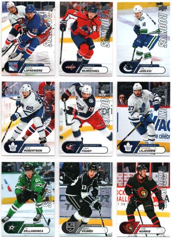 Ohessa kuva 2020-21 Upper Deck NHL ROOKIE BOX SET -sarjan korteista