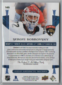 2022-23 Artifacts Hockey DUAL PATCH PURPLE AUTO 01/10 #145 Sergei Bobrovsky (G) Panthers