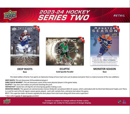 Series 2 sports the next 250 cards (251-500) of the 2023-24 Upper Deck base set. Annually, the Upper Deck base set is the most widely-collected base set in hockey. The set includes 198 veteran cards, 49 Young Guns cards (the most anticipated rookie cards of the season!) and three checklist cards. Keep an eye out for Outburst parallels!