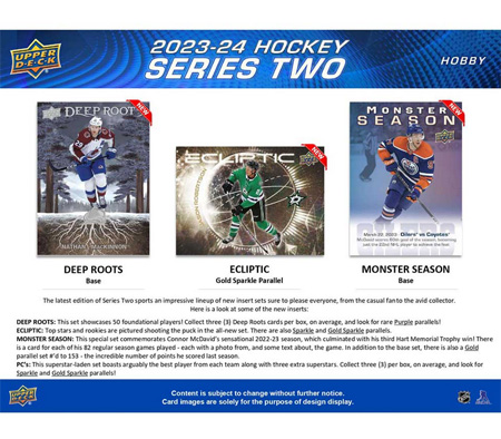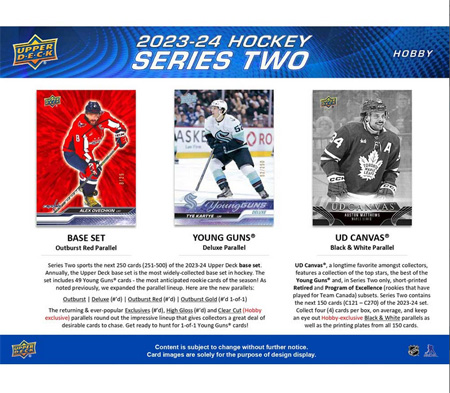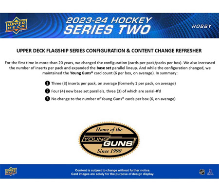 • Series 2 sports the next 250 cards (251-500) of the 2023-24 Upper Deck base set. Annually, the Upper Deck base set is the most widely-collected base set in hockey. The set includes 198 veteran cards, 49 Young Guns® cards (the most anticipated rookie cards of the season!) and three checklist cards. As noted above, we expanded the parallel lineup.