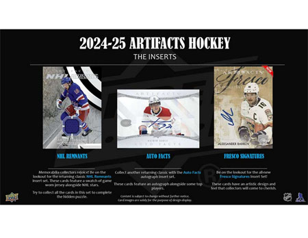 • Autograph and Memorabilia Collectors rejoice! Search for returning classic Artifacts insert sets such as the NHL Remnants and Auto Facts. Both insert sets feature an updated design and a fresh checklist that collectors are sure to be searching for.