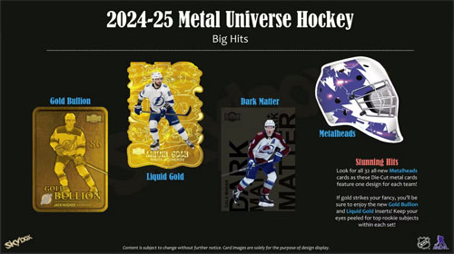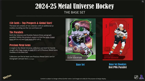 The 2024-25 Skybox Metal Universe Hockey product sports a 150-card Base Set designed to take collectors to another universe! The Base Set breaks down as follows: Veterans (1-100) and Rookies (101-151). Collectors should expect 1 Base Set Rookie card per pack, on average. Be on the lookout for parallels of the Base Set including PMG (Precious Metal Gems) and autograph parallels, including the Gold Auto (#’d 1-of-1)!