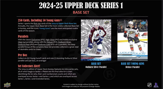 • Series 1 sports the first 250 cards of the 2024-25 Upper Deck Base Set. Annually, the Upper Deck Base Set is the most widely-collected Base Set in hockey. It includes 198 veteran cards, 49 Young Guns® rookie cards and three checklist cards. The iconic Young Guns® are the most anticipated rookie cards of the season.