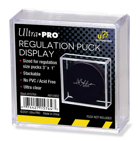 Protect and display your valuable regulation size puck with this 2-piece holder. The Regulation Puck display has special additives to protect your valuables from harmful UV rays. Ultra-clear, stackable. and sized for regulation size pucks 3″ x 1″.